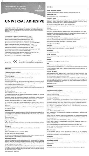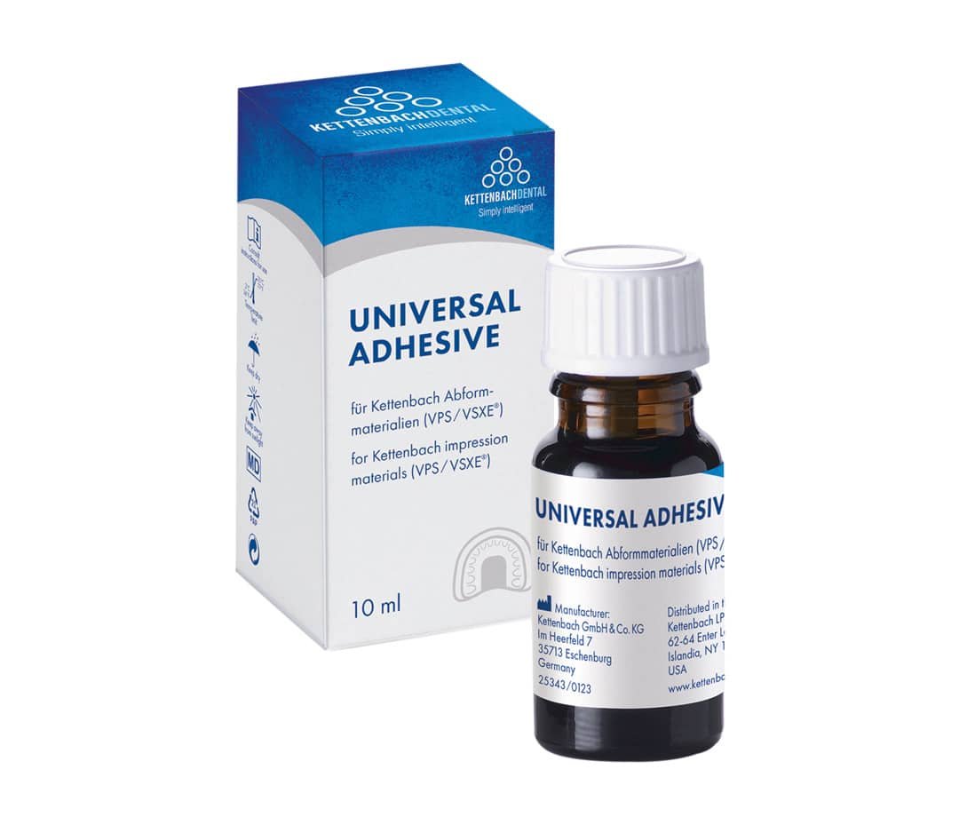 Universal Adhesive is speciaal ontwikkeld als hechtlaag voor in de afdruklepel in combinatie met VSXE One maar heeft ook een uitstekende hechtende werking i.c.m. de andere afdrukmaterialen van Kettenbach Dental. Bij een gesloten lepel altijd de bijbehorende adhesief gebruiken en steeds eerst goed op de lepel laten drogen voordat de afdruklepel gevuld gaat worden met afdrukmateriaal.